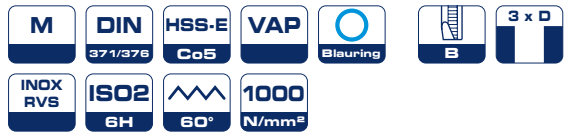 De Blauwring machinetap DIN 371 vorm B is speciaal ontwikkeld voor het nauwkeurig snijden van metrische ISO-schroefdraad (DIN 13), en is bij uitstek geschikt voor het bewerken van roestvast staal zoals AISI 304 en AISI 316. Dankzij de speciale snijkantgeometrie en een geëvaporaliseerd oppervlak (VAP-coating) levert deze machinetap optimale prestaties bij het tappen van moeilijk verspaanbare materialen.